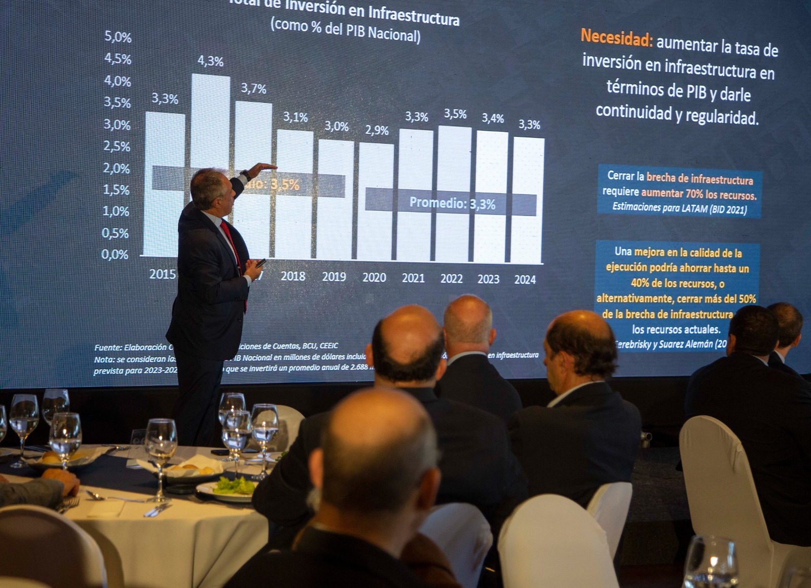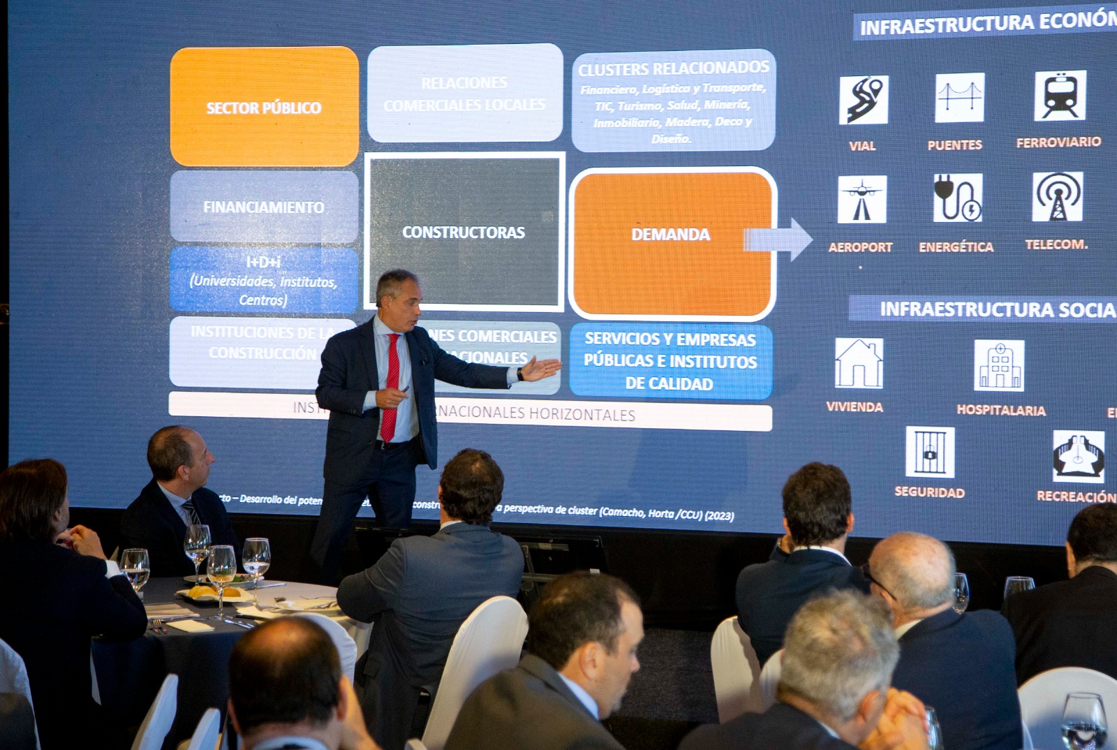 Fueron disertantes de este encuentro el Presidente de la Cámara de la Construcción del Uruguay, Ing. Alejandro Ruibal y el Ministro de Transporte y Obras Públicas, Sr. José Luis Falero. En el marco de la oratoria, se destacó la relevancia de la cadena de valor de la construcción, la situación actual y las perspectivas hacia adelantem así como los desafíos que deberían enfrentarse para mejorar la planificación y ejecución de la inversión en infraestructura, con el propósito de empujar el crecimiento y desarrollo económico.